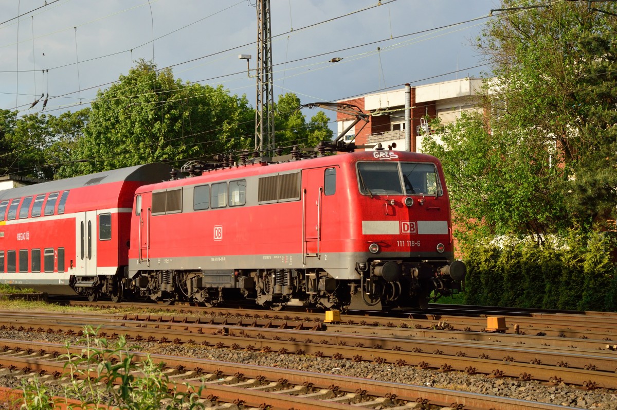 Am Abend des 2.8.2014 kommt ein RE4 Zug nach Dortmund Steuerwagen voraus, geschoben von der 111 118-6, in den Rheydter Hbf aus Erkelenz eingefahren. Andreas Strobel