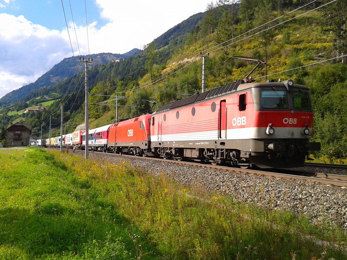 1144 278-9 + 1116 189-2 mit der ROLA 43253 (Salzburg - Triest) am 9.9.2015 in Penk. Hier war aufgrund einer heißgelaufenen Bremse, an einem der Wagons, eine Viertelstunde Pause angesagt. Hans-Peter Kurz