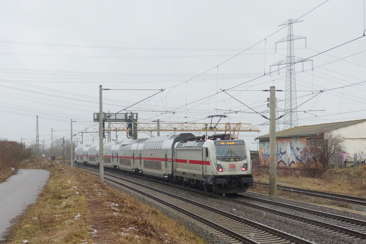 Wie eine Schlange schlängelt sich dieser ICE4 durch die Mitte Thrüingens. Von Berlin fährt er über Leipzig, Erfurt und Frankfurt nach Stuttgart. Gleich wird er die kleine Ortschaft Ingersleben passieren - westlich von Erfurt.