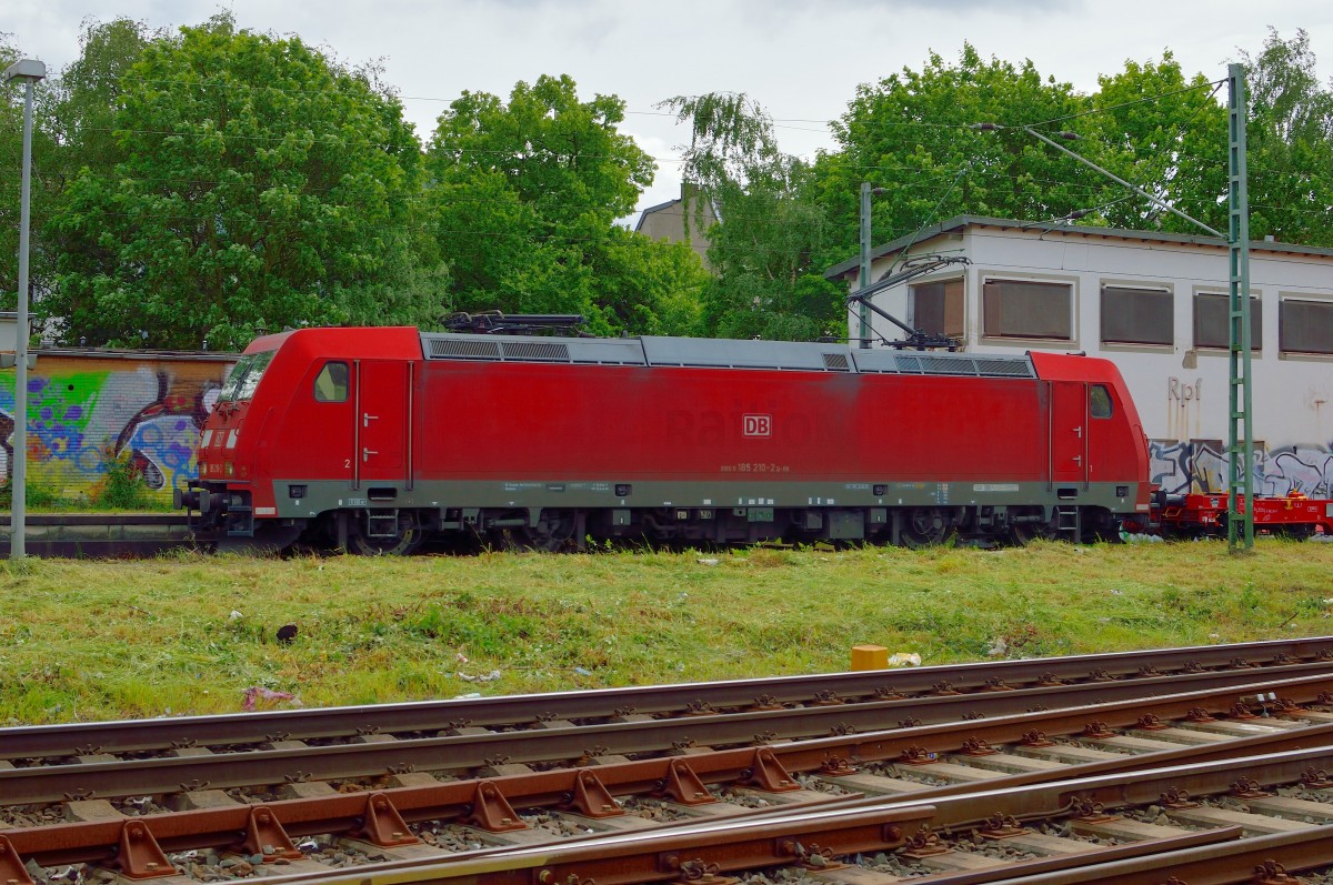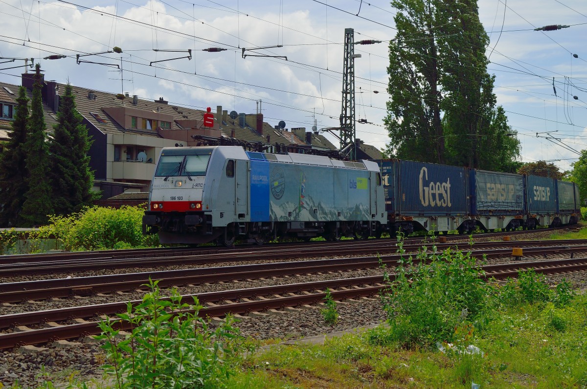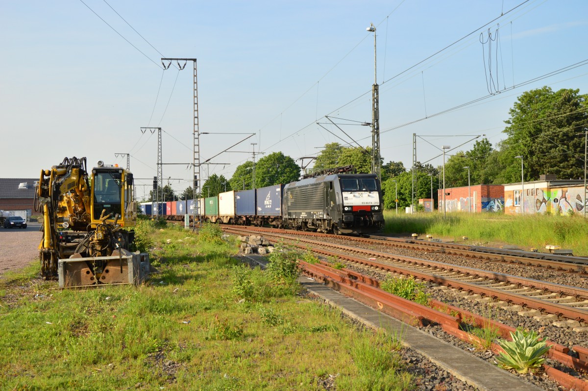 Nach eine kurzen Halt in Rheydt Hbf fährt die 189 213 mit ihrem Containerzug gleich in den eingleisigen Abschnitt zwischen Rheydt Hbf und Rheydt-Odenkirchen ein.5.5.2014 Andreas Strobel