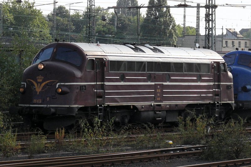 DSB MY 1143 der Gleisbaufirma Eichholz in noch originaler, dänischer Farbgebung mit DSB Krone und Flügelrad an den Fronten und DSB Schriftzug an den Seiten wird von den beiden Eichholz Lokomotiven V 170 1138 (blau) und 1142 (rot) am 24.09.2005 in Wanne-Eickel Hauptbahnhof abgeholt. Drei Nohabs auf einen Schlag, das hat der Eisenbahnfan natürlich besonders gerne ;-) Hier abgebildet nur die Schönste - meine Meinung nach - der drei Lokomotiven im dämmerigen Abendlicht. Wolfgang Koenigsfeld