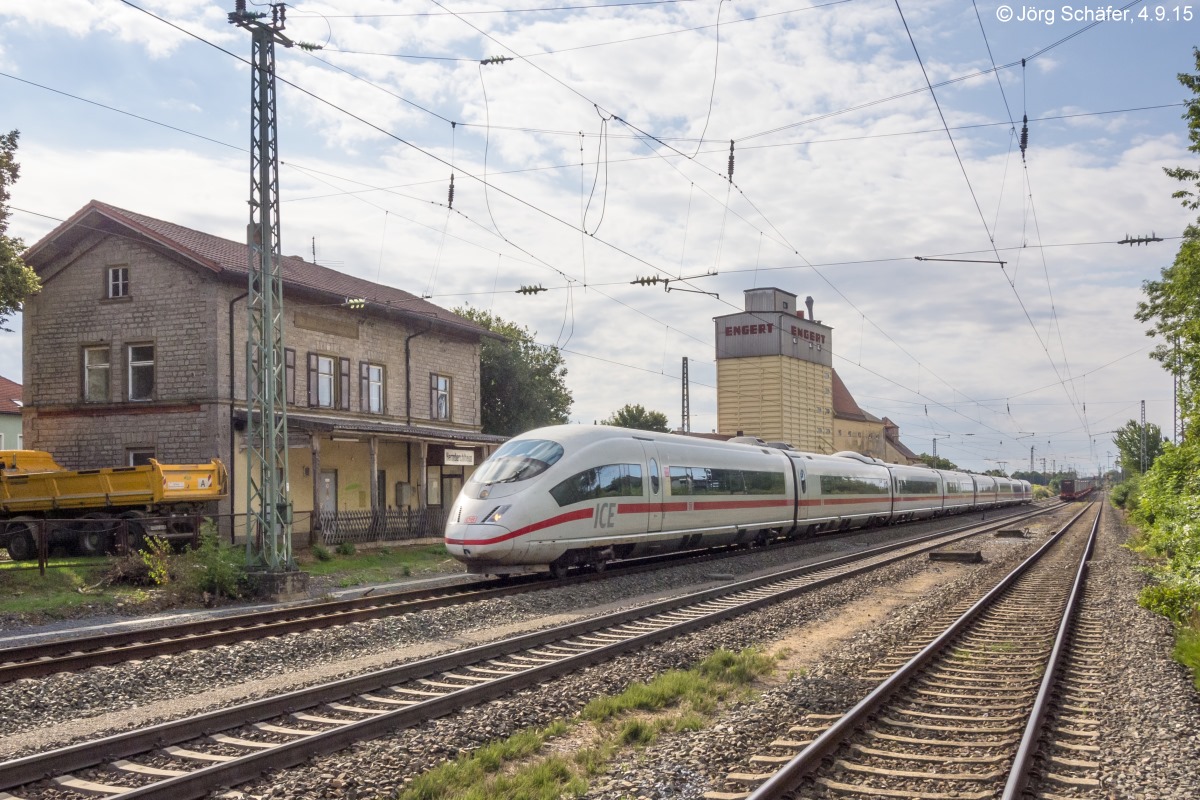 Panorama-Aufnahmen von ICEs im kurvenreichen Abschnitt zwischen Gollhofen und Uffenheim. Im Hintergrund der Kirchturm von Geckenheim. (Blick nach Osten am 11.8.04) Jörg Schäfer