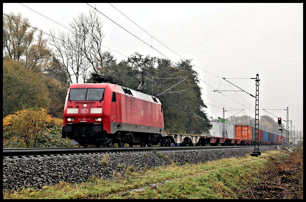 Bei typischem Novemberwetter mit Nieselregen erreicht hier die DB 152014-7 am 4.11.2021 um 12.37 Uhr mit ihrem Container Zug aus Richtung Osnabrück kommend Hasbergen an der Rollbahn. Gerd Hahn