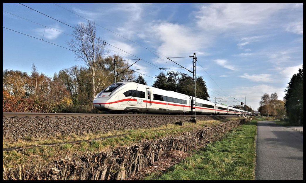 DB Fernverkehr Tz 110 (401 010/510) "Gelsenkirchen" als ICE 929 "Kieler Bucht" Hamburg-Altona - Passau Hbf (Diepholz, 08.10.2021). - Standort des Fotografen: BÜ der öffentlichen Straße "An der Bahn" über das nicht mehr benutzte Anschlussgleis zum Fliegerhorst Diepholz der Bundeswehr. Reinhard Kühn