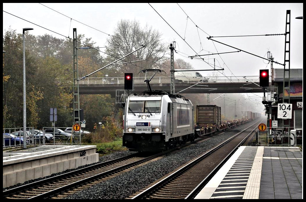 Mit einem schwach ausgelasteten Container Zug am Haken kommt hier am 4.11.2021 um 11.22 Uhr die Metrans 386040-0 in Richtung Ruhrgebiet fahrend durch den Bahnhof Natrup Hagen. Gerd Hahn