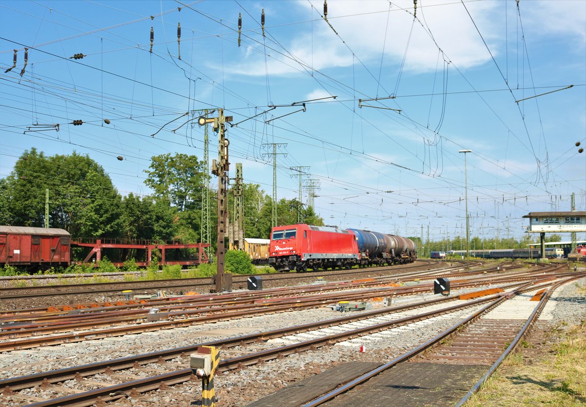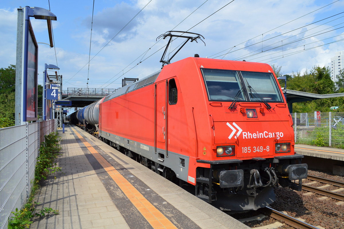 Ich schaute etwas ungläubig auf die Frontnummer, aber tatsächlich es ist eine von den für viele Bahnkenner kaum nachvollziehbar neuere veräußerte DB Cargo 185ér, die jetzt im Eigentum von der RheinCargo GmbH & Co. KG als "185 349-8" [NVR-Number: 91 80 6185 349-8 D-RHC] Kesselwagen zieht, hier am 01.08.19 Durchfahrt Bahnhof Berlin-Hohenschönhausen. Lothar Stöckmann
