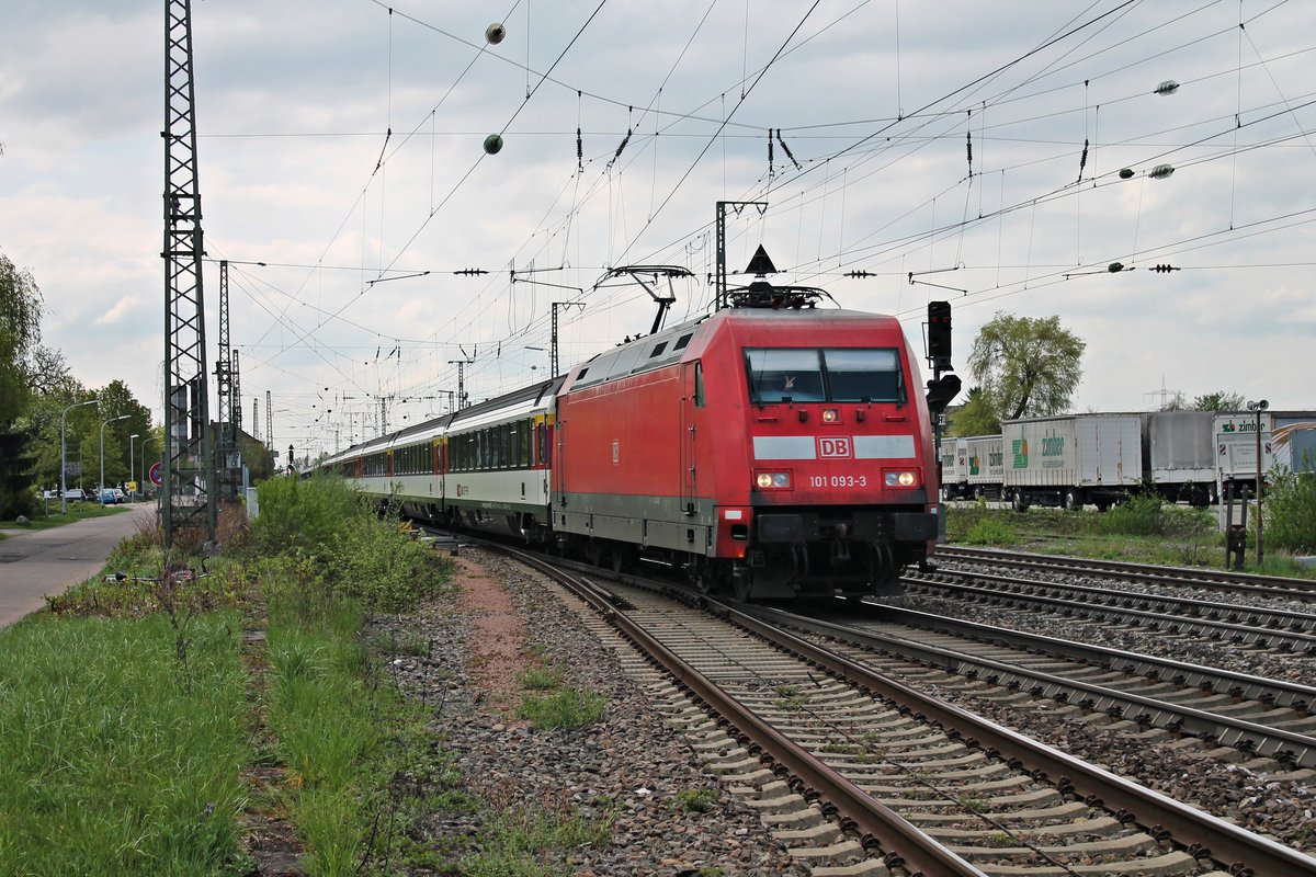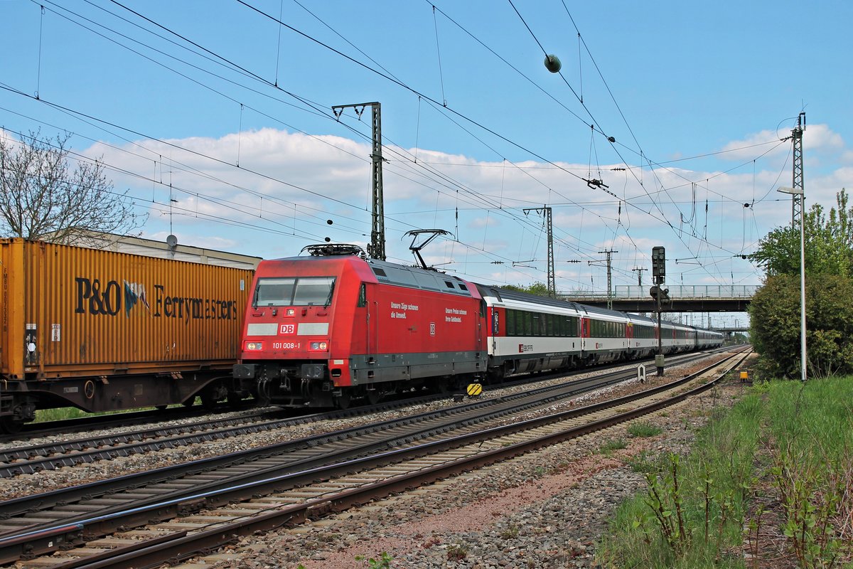 101 008-1 am 18.04.2015 mit dem EC 7 (Hamburg Altona - Zürich HB/Chur HB), als sie den Containerzug von Railtraxx 185 515-4 im Bahnhof von Müllheim (Baden) in Richtung Basel überholte. Tobias Schmidt