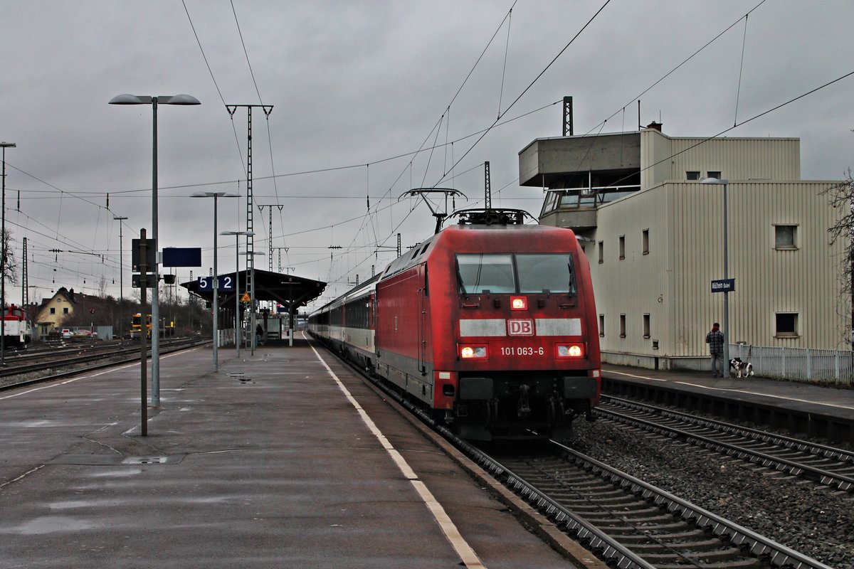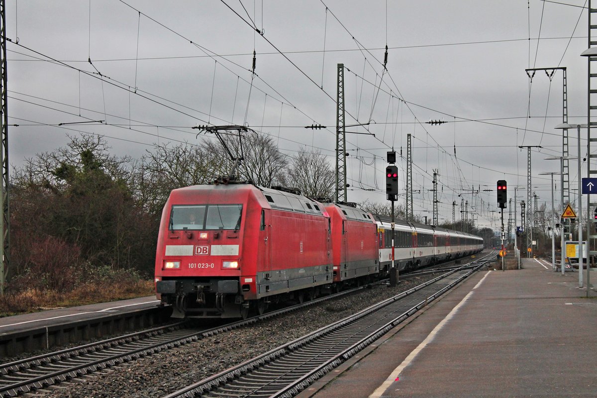 Am 17.01.2015 bespannte die 101 023-0 den EC 6 (Chur HB/Zürich HB - Hamburg Altona) mit der kalt mitlaufenden 101 085-9, als sie durch Müllheim (Baden) in Richtung Freiburg fuhr. Tobias Schmidt