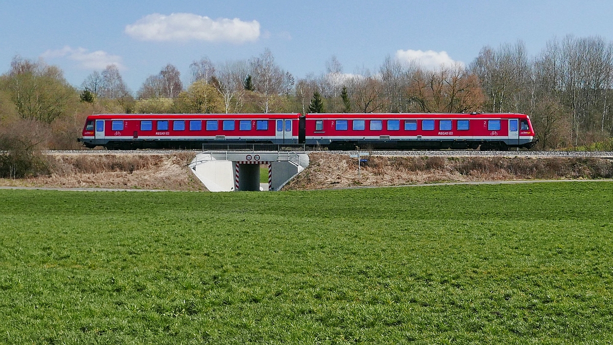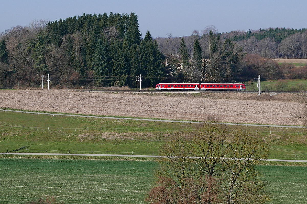 Am 13.04.2020 fuhren zwei Dieseltriebwagen der Baureihe 628 von der Südostbayernbahn über die Main-Lahn-Bahn nach Limburg(Lahn). Hier hat der Zug kurz hinter Niederbrechen den Bahnübergang unterhalb der Berger Kirche passiert. Anton Eisenbach
