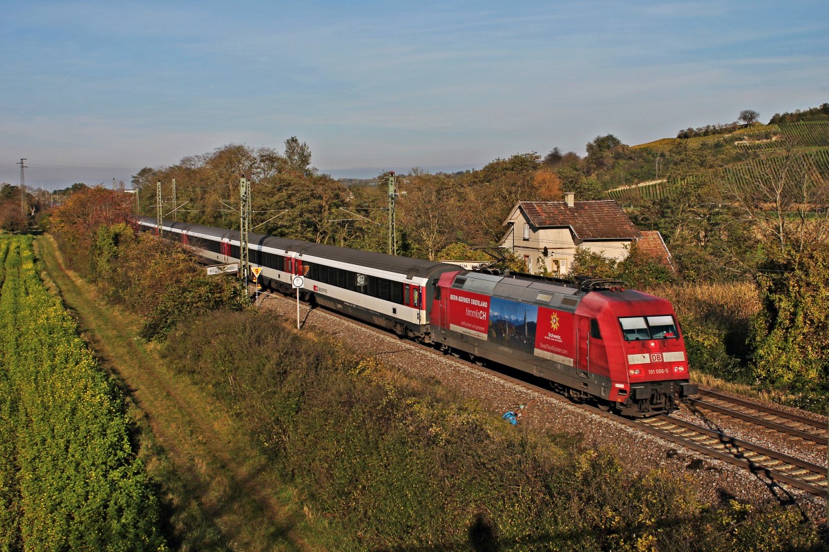 101 006-5 "Bern-Berner Oberland himmlisCH" am 30.10.2014 mit dem EC 9 (Hamburg Altona - Zürich HB) bei Müllheim (Baden) und fuhr gen Basel. Tobias Schmidt