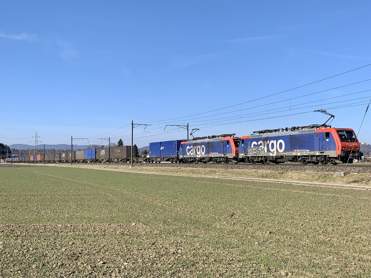 Vierfach Traktion, mit den Loks 474 003-1, 474 015-5, 193 256-5 und 189 106-8 durchfährt den Bahnhof Pratteln. Die Aufnahme stammt vom 19.03.2021. Markus Wagner