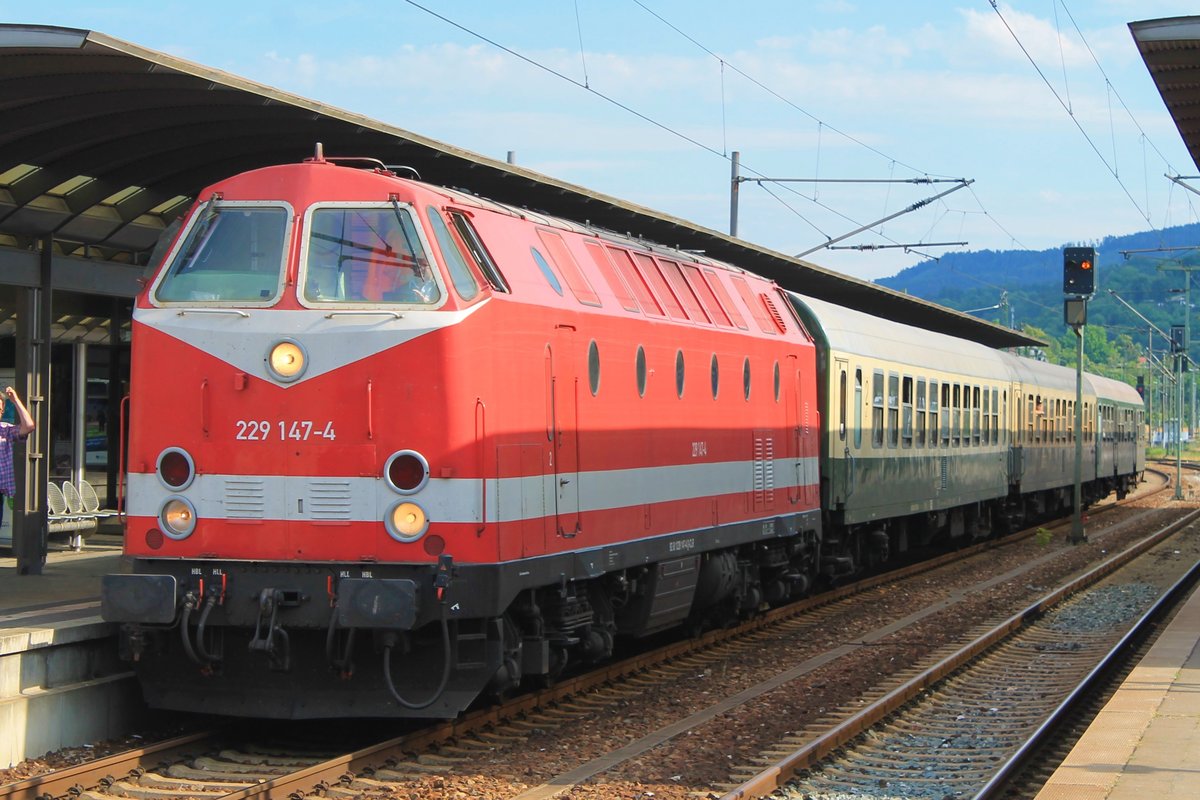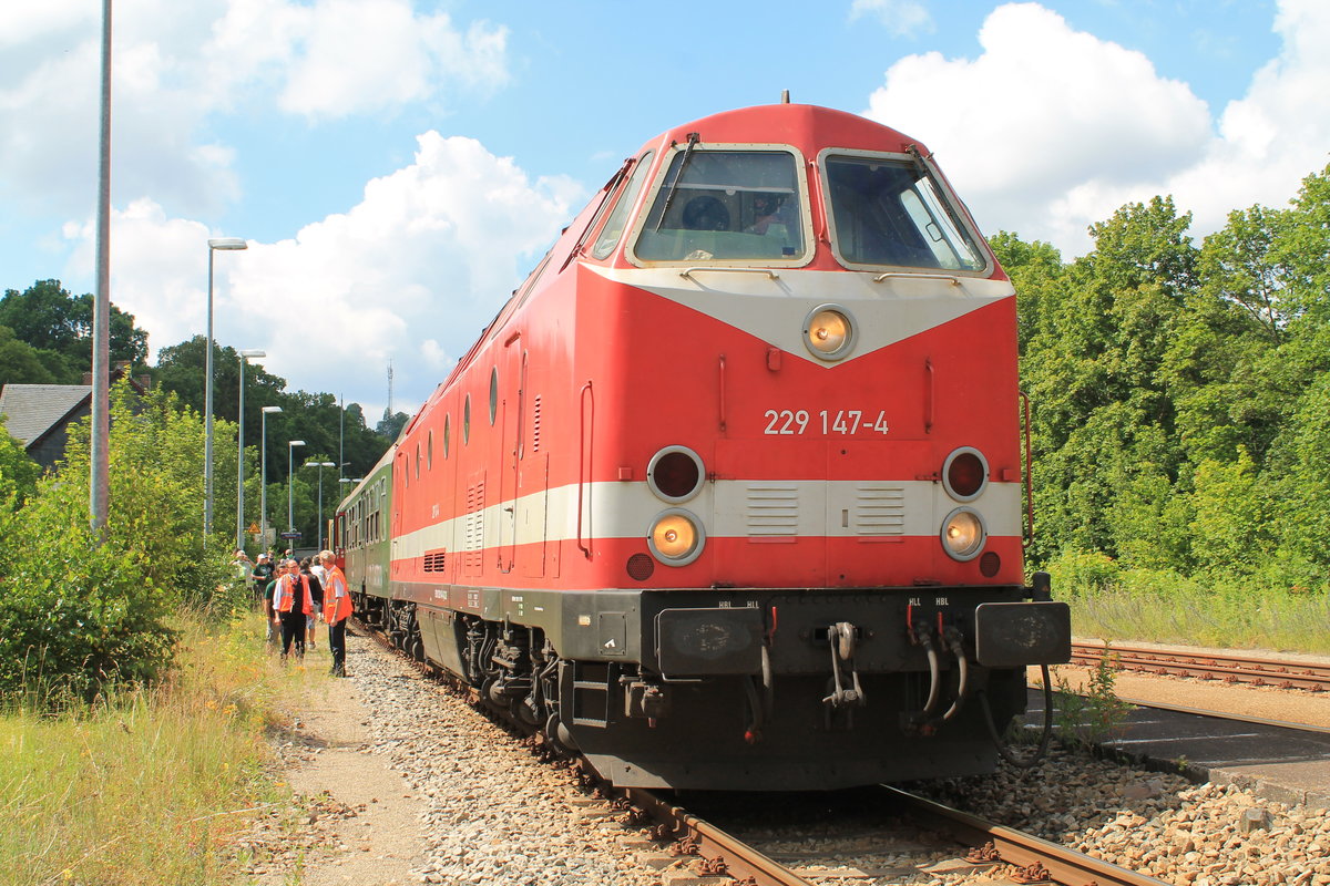 229 147 (CLR) am 6.7.2019 mit dem "Saale-Sormitz-Express" beim Zwischenhalt in Saalfeld/Saale. Der Traditionszug war dem Rückweg von Blankenstein nach Erfurt. Markus Klausnitzer