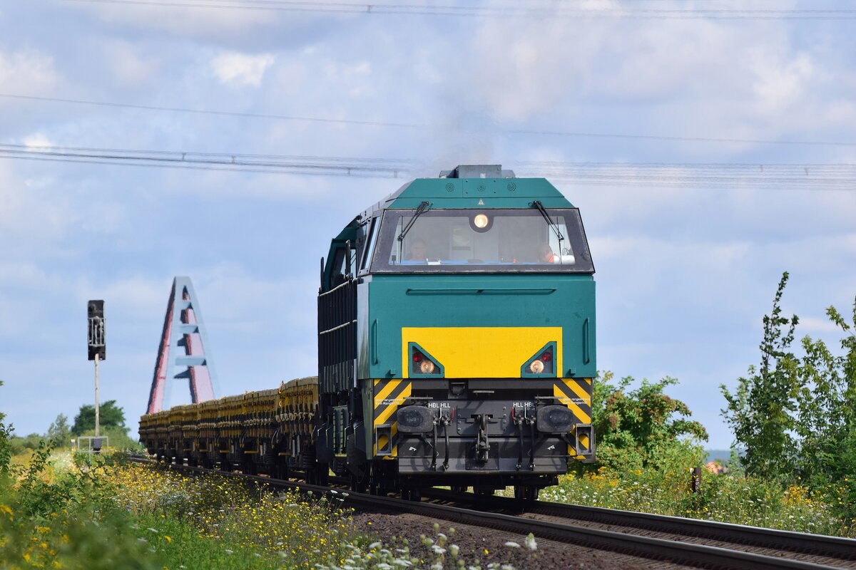 Cargo Logistik Rail-Service GmbH, Barleben (CLR) mit "My 1138" (NVR: "92 80 1227 004-9 D-CLR") und einigen Drehgestell-Flachwagen am Haken am 08.06.22 Höhe Bf. Niederndodeleben (Nähe Magdeburg). Lothar Stöckmann