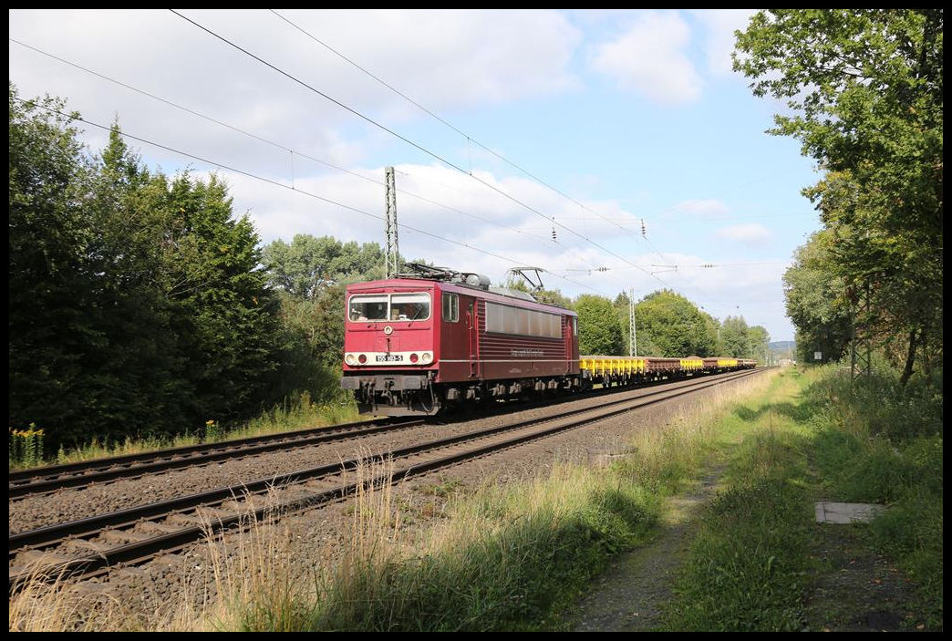 Die inzwischen private 155103-5 von CLR ist hier mit einem Schotterzug auf der Rollbahn in Lengerich Schollbruch am 1.9.2021 um 16.32 Uhr nach Bochum unterwegs. Gerd Hahn