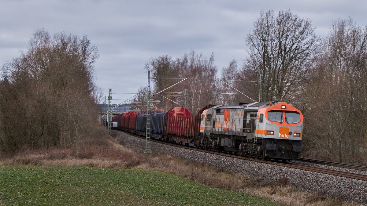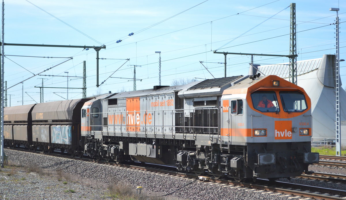 hvle Tiger "V330.7" (NVR: 92 80 1250 005-6 D-HVLE) mit Schüttgutwagenzug am 18.12.19 Durchfahrt Bf. Saarmund, Viele Grüße an den Tf. !!!!! Lothar Stöckmann