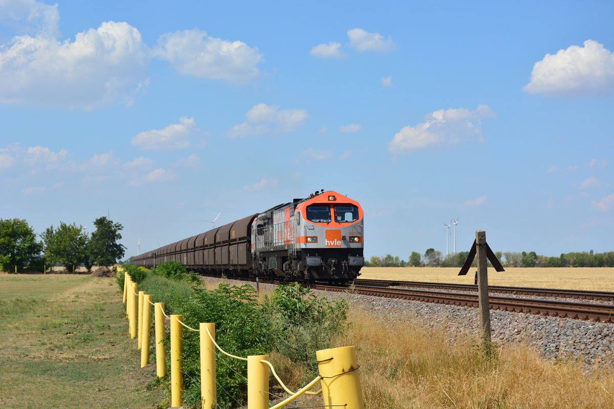HVLE Tiger V 300-7 hat hier am 12.07.2020 um 19.51 Uhr bei Tecklenburg Ledde einen langen Schotterzug am Haken, den sie von Grohnde zum Bahnhof in Ibbenbüren Esch bringt. Gerd Hahn