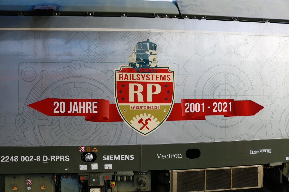 Logo an Railsystems RP Siemens Vectron DualMode 248 002-8 abgestellt in Hanau Hbf Südseite am 04.02.23