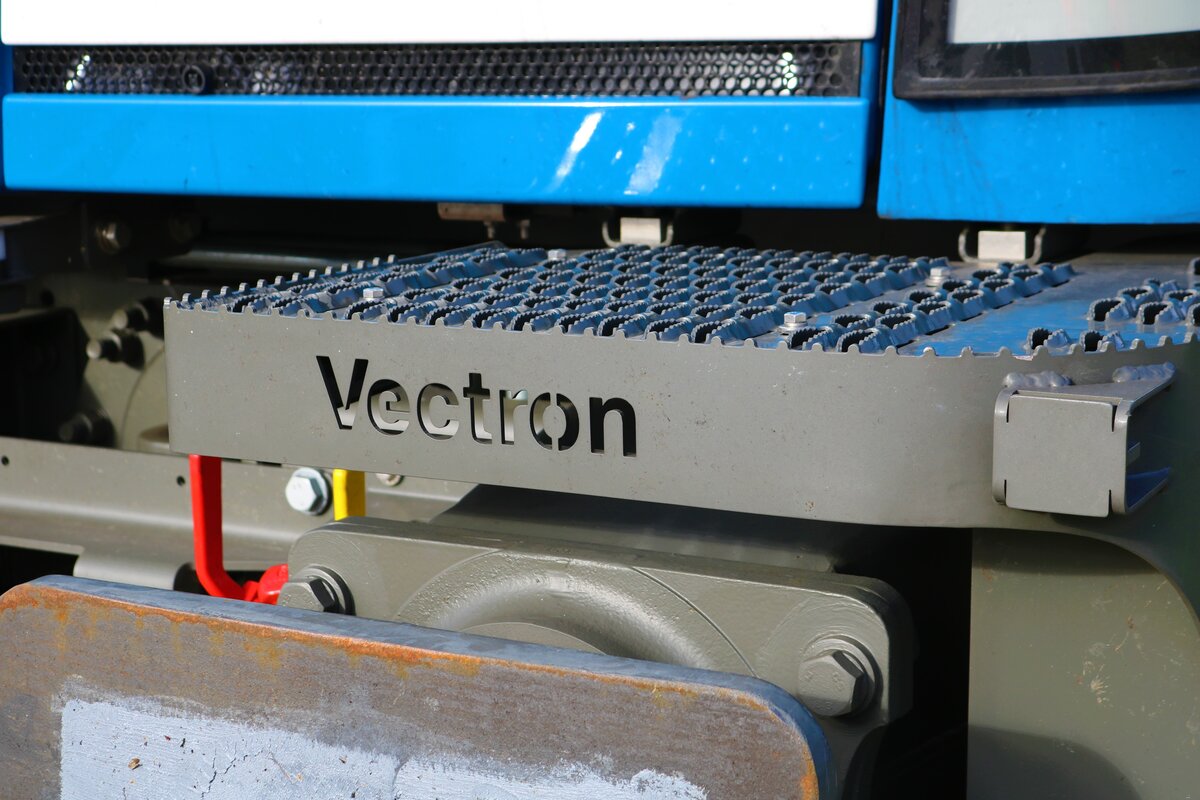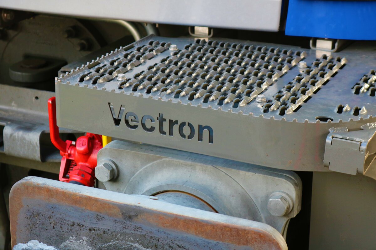 Vectron Schriftzug an Railsystems RP Siemens Vectron DualMode 248 002-8 abgestellt in Hanau Hbf Südseite am 04.02.23 vom von einem Gehweg aus fotografiert