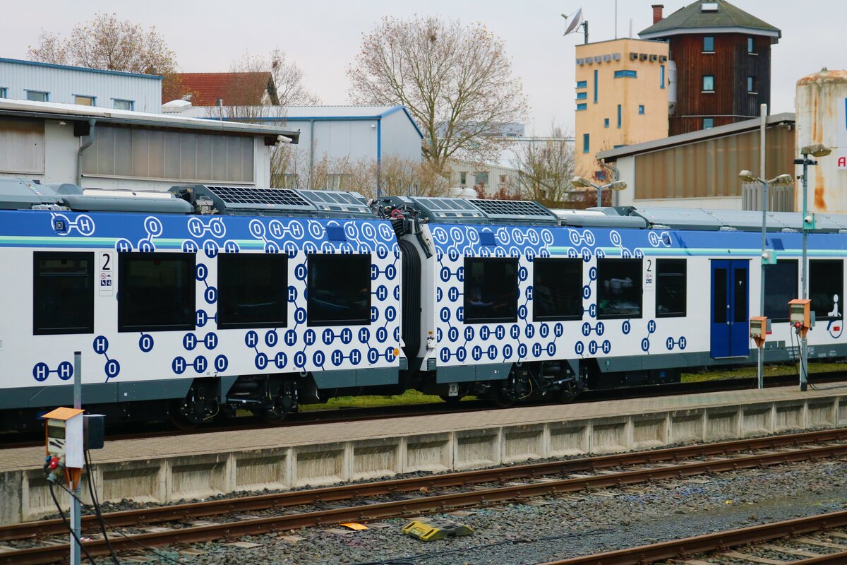 Wasserstoff Design an einen Start Alstom iLint in Usingen Bhf am 01.12.22 vom Bahnsteig aus fotografiert