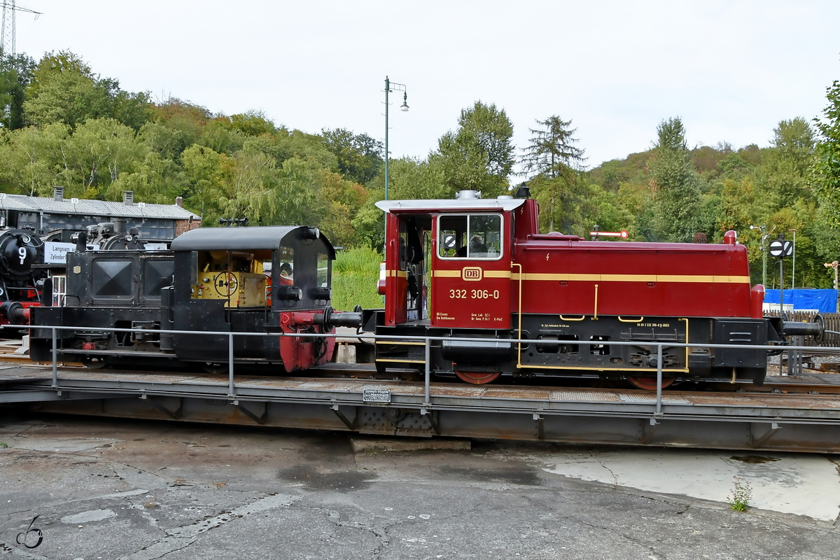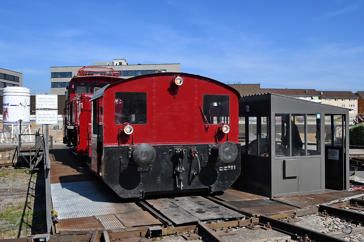 Die Diesellokomotive Köf 4714, Baujahr 1934 routiert gemeinsam mit der 1940 gebauten Elektrolokomotive 163 008-6 auf der Drehscheibe im Eisenbahnmuseum Heilbronn. (September 2019) Christian Bremer