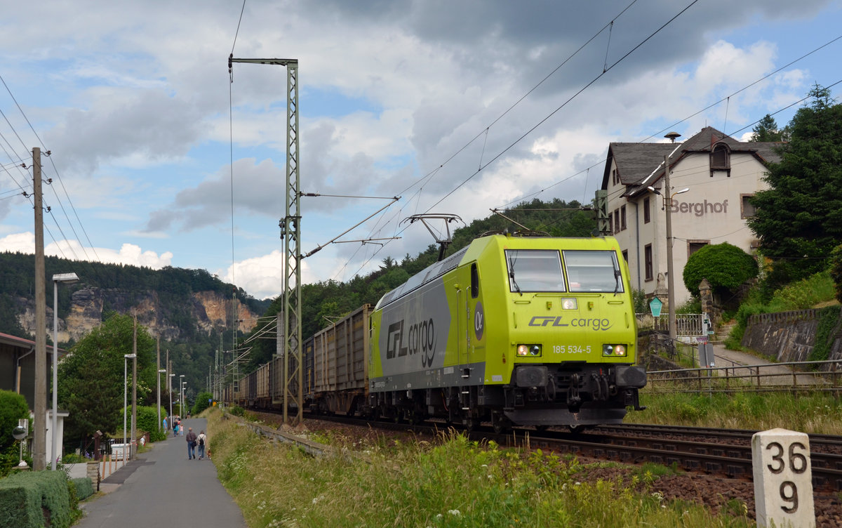 185 519 der CFL Cargo zog am 17.07.16 einen Güterzug, bestehend aus Schiebewandwagen und mit Stahlrollen beladenen Flachwagen durch Schmerkendorf Richtung Dresden. Martin Schneider