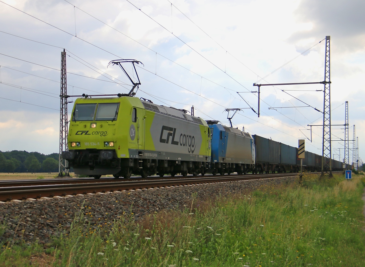 Alpha Trains/CFL Cargo 185 534-5 in Doppeltraktion mit 185 519-6 und Containerzug in Fahrtrichtung Wunstorf. Aufgenommen am 29.07.2015 in Dedensen-Gümmer. Jens Baumhauer