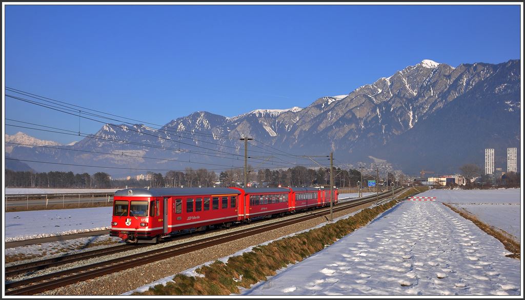 Vorortszug der alten Art mit Be 4/4 514 und ABt 1715 als S2 1566 bei Felsberg. Im Hintergrund strahlen die Twin Towers von Chur West und der 2266m hohe Montalin. (11.02.2015) Herbert Graf