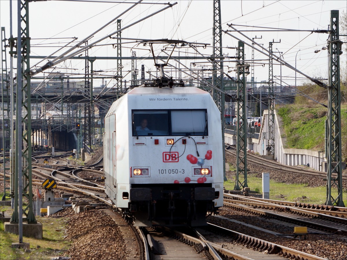 101 050 "Jugend forscht" kommt aus ihrer Warteposition, um den EC 172 von Budapest-Keleti nach Hamburg-Altona zu übernehmen; Dresden, 12.04.2015