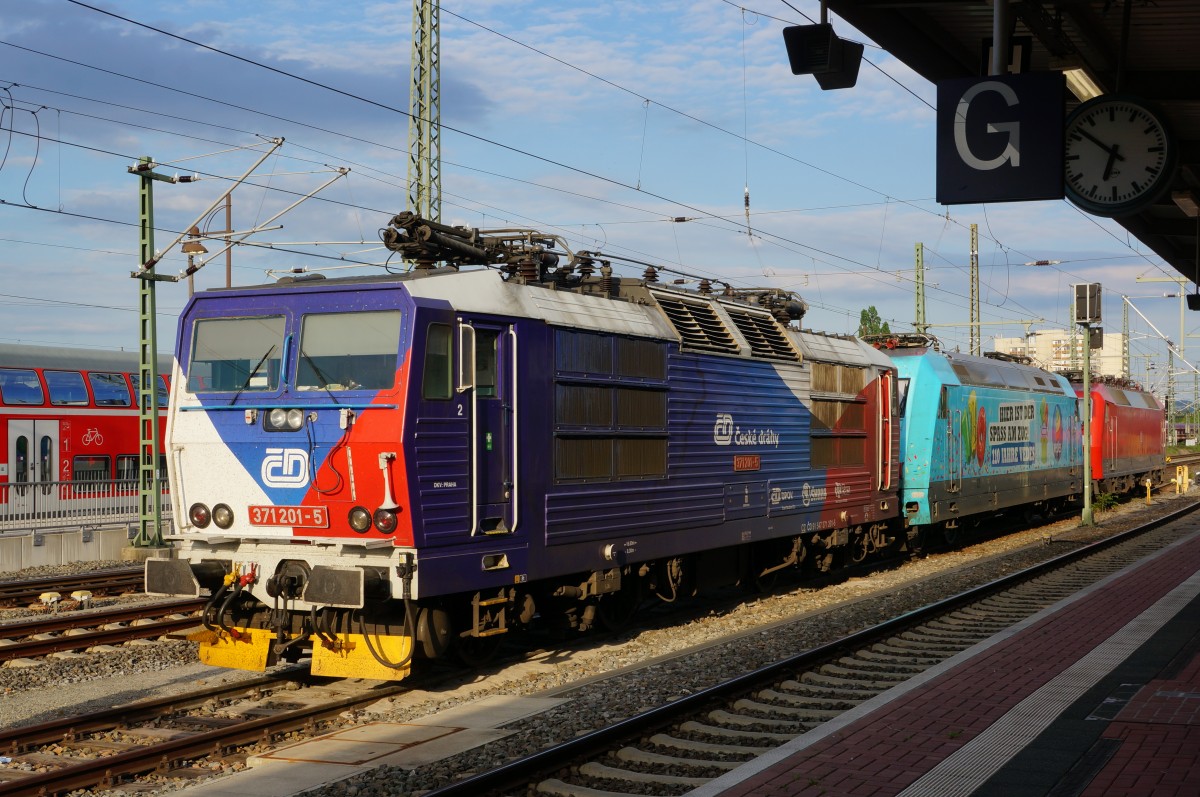Dies Motiv war nur während des Streiks der GDL möglich: die beiden DB-Loks 120 103 und 101 102 "HIER IST DER SPASS AM ZUG 110 JAHRE VEDES" stehen vor CD 371 201. Normalerweise wartet hier nur eine CD-Lok auf die Rückfahrt nach Tschechien mit einem EC; Dresden Hbf., 08.05.2015