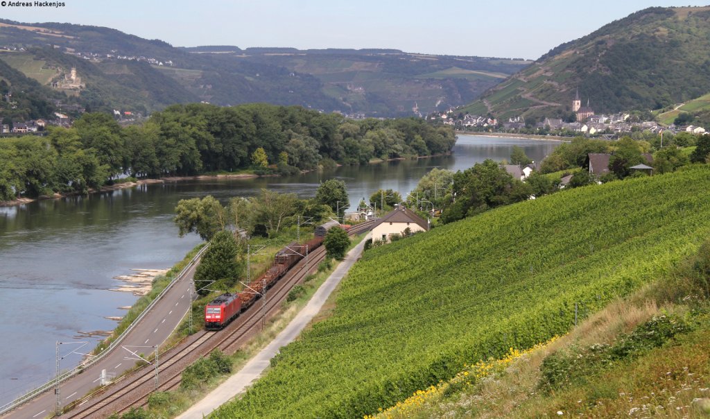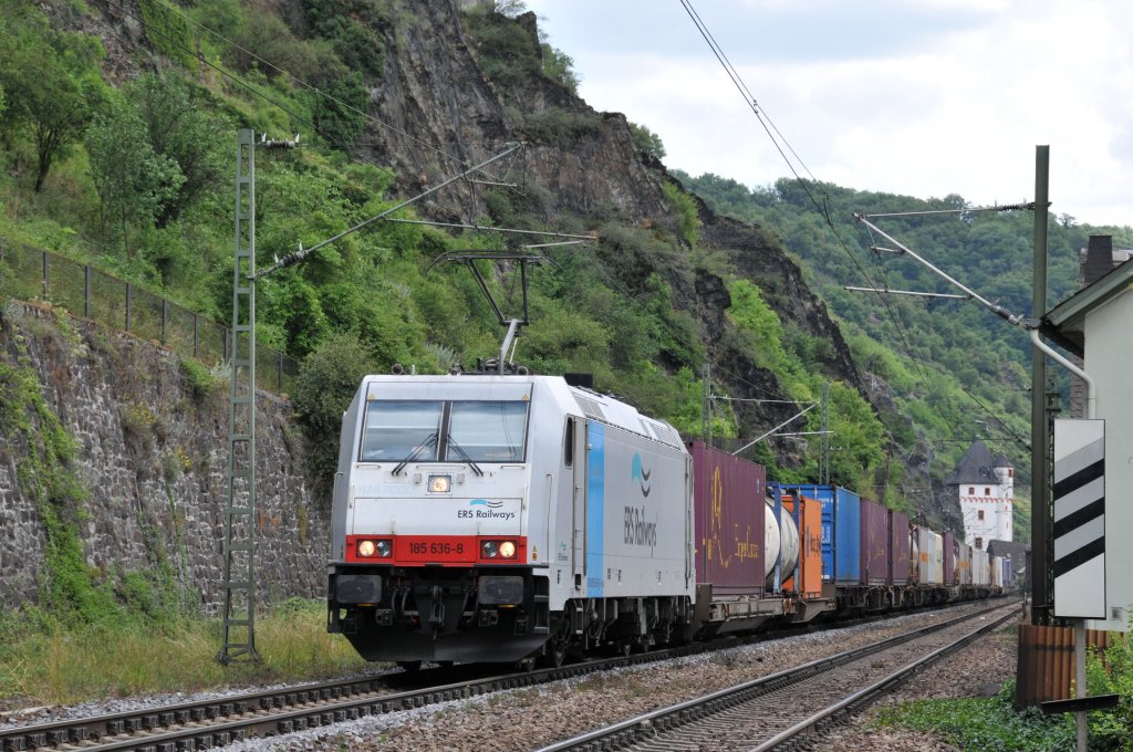 185 636-8 von ERS Railways zieht einen Containerzug rechtsrheinisch Richtung Koblenz. Die Aufnahme entstand in St.Goarshausen am 17/06/2011.