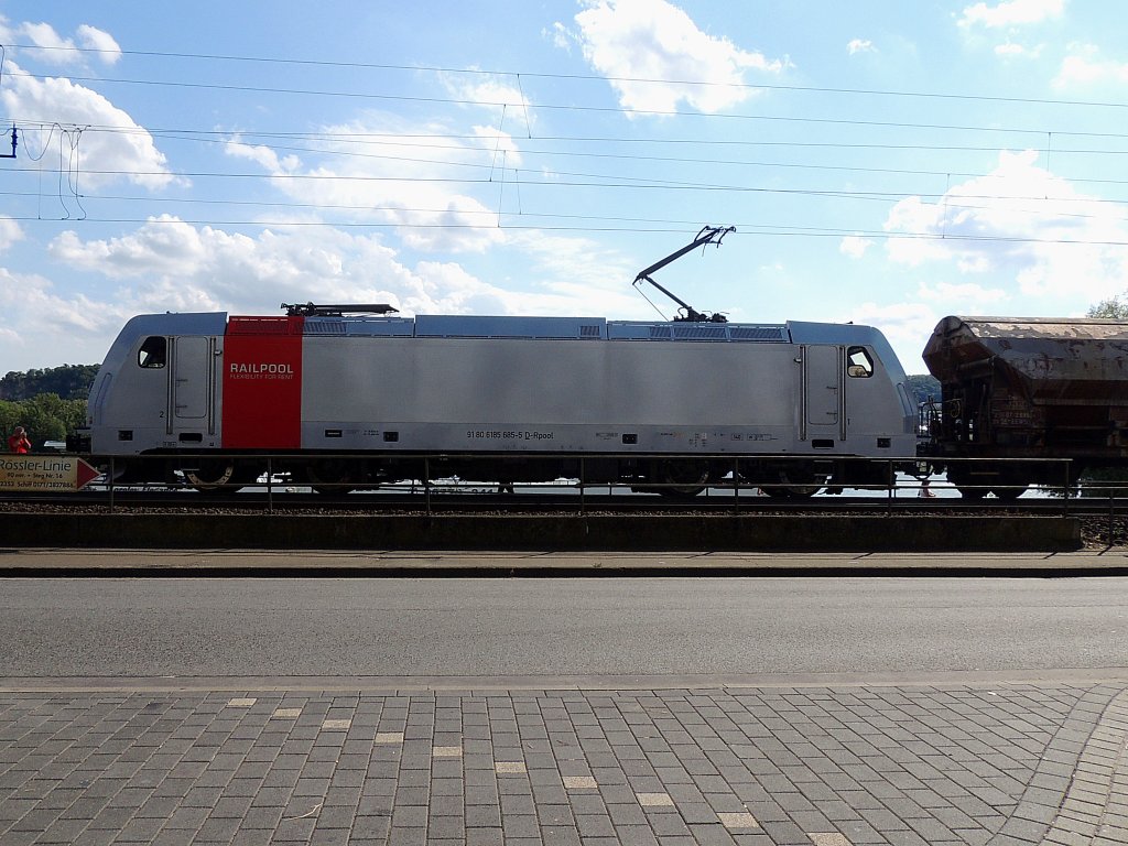 185 685-5 von RAILPOOL donnert mit einem Getreidezug an den vielen Gastgärten entlang der Rheinstrasse in Rüdesheim vorbei; 120829
