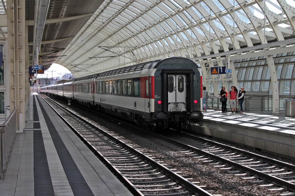Nachschuss auf den Wagenpark vom EC 6 (Chur HB (Kurswagen)/Zürich HB - Hamburg-Altona), als er am 24.05.2014 mit 120 154-0 als Zugpferd durch Ludwigshafen (Rhein) Mitte gen Rheintal fuhr. Tobias Schmidt