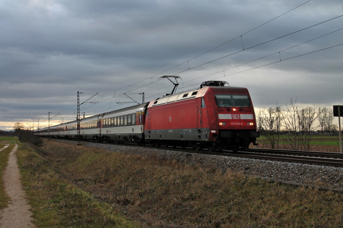 Am 03.01.2014 bespannte die 101 096-6 den EC 6 (Zürich HB/Chur HB (Kurswagen) - Hamburg-Altona), als sie nördlich von Müllheim (Baden) am Winzerort Hügelheim gen Freiburg fuhr. Peace an den netten Tf zurück !! Tobias Schmidt