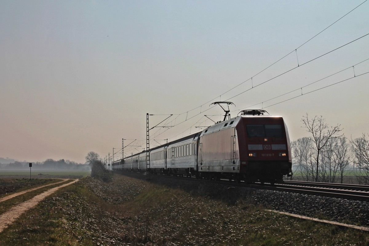 Am 08.03.2014 bespannte die 101 010-7 den EC 6 (Chur HB (Kurswagen)/Zürich HB - Hamburg-Altona), als sie aus dem Gegenlicht bei Hügelheim gen Freiburg fuhr. Tobias Schmidt