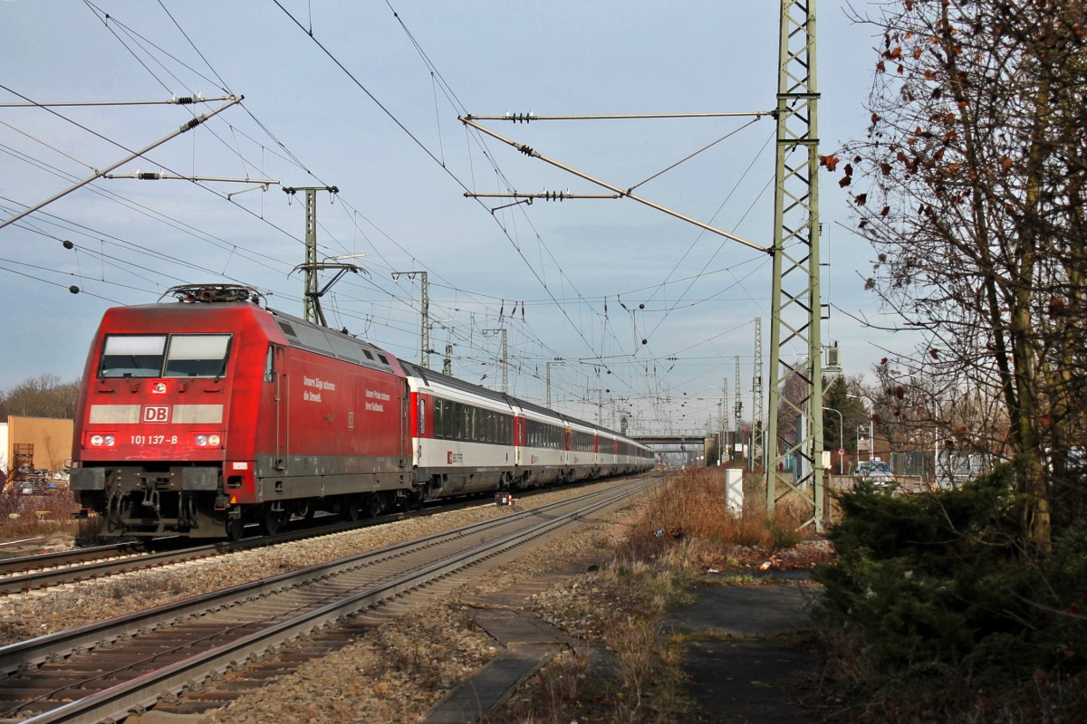 Ebenfalls am 25.01.2014 in Müllheim (Baden), die Hamburger 101 137-8 mit dem EC 7 (Hamburg-Altona - Zürich HB/Chur HB) gen Katzenbergtunnel. Die ersten drei Wagen nach der Lok, sind Kurswagen nach Chur HB, die in Basel SBB vom Zug abgekoppelt werden und an einem Schweizer-IC dran gehängt werden. Tobias Schmidt