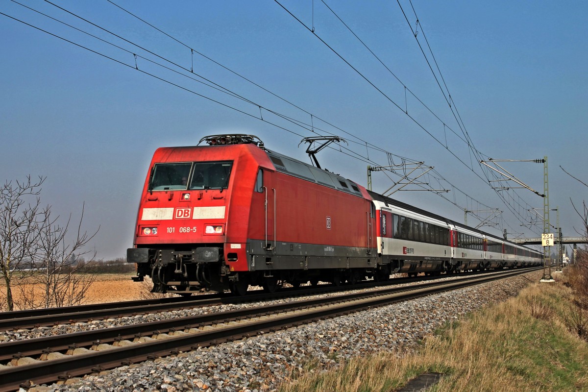 Vorbeifahrt am 08.03.2014 von der 101 068-5 mit dem EC 7 (Hamburg-Altona - Zürich HB/Chur HB (Kurswagen)) in Hügelheim, kurz vor der Durchfahrt in Müllheim (Baden). DIe ersten drei Wagen hinter der Lok, sind die Kurswagen, die ab Basel SBB mit einem IC nach Chur Hb überstellt werden. Tobias Schmidt