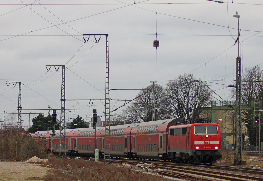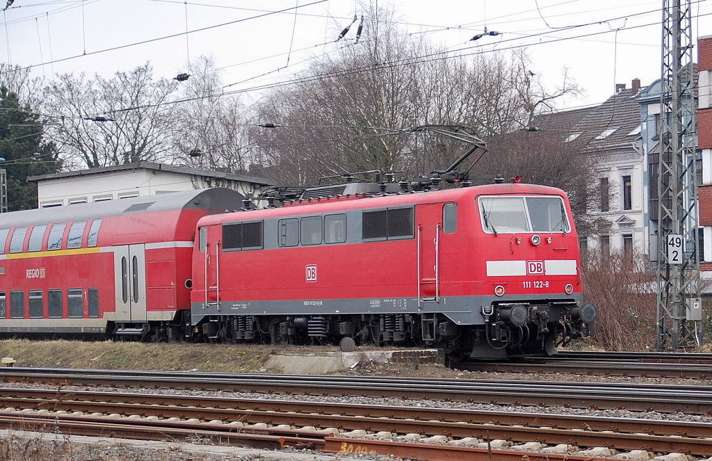 Mit einem RE4 Verstärker verlässt gerade die 110 418-1 mit N-Wagen und Karlsruhersteuerwagen am Nachmittg des 21.2.2011 den Hauptbahnhof Rheydt in Richtung Aachen, nächster Halt ist Erkelenz. Andreas Strobel