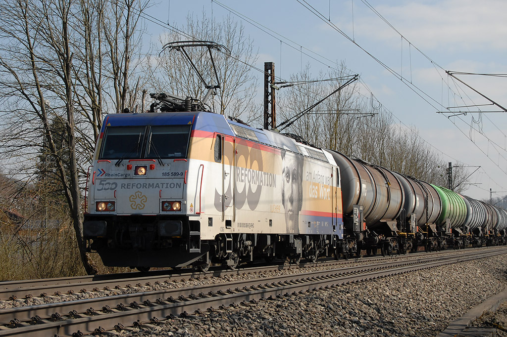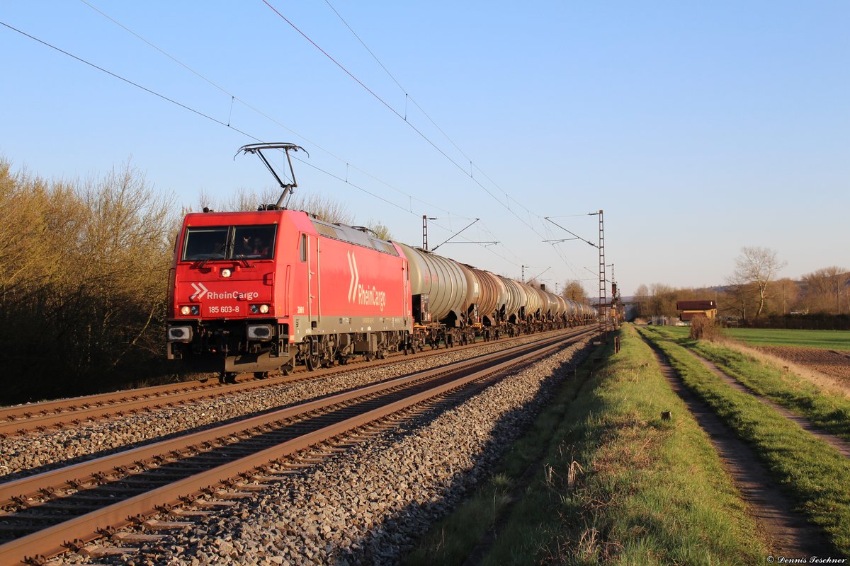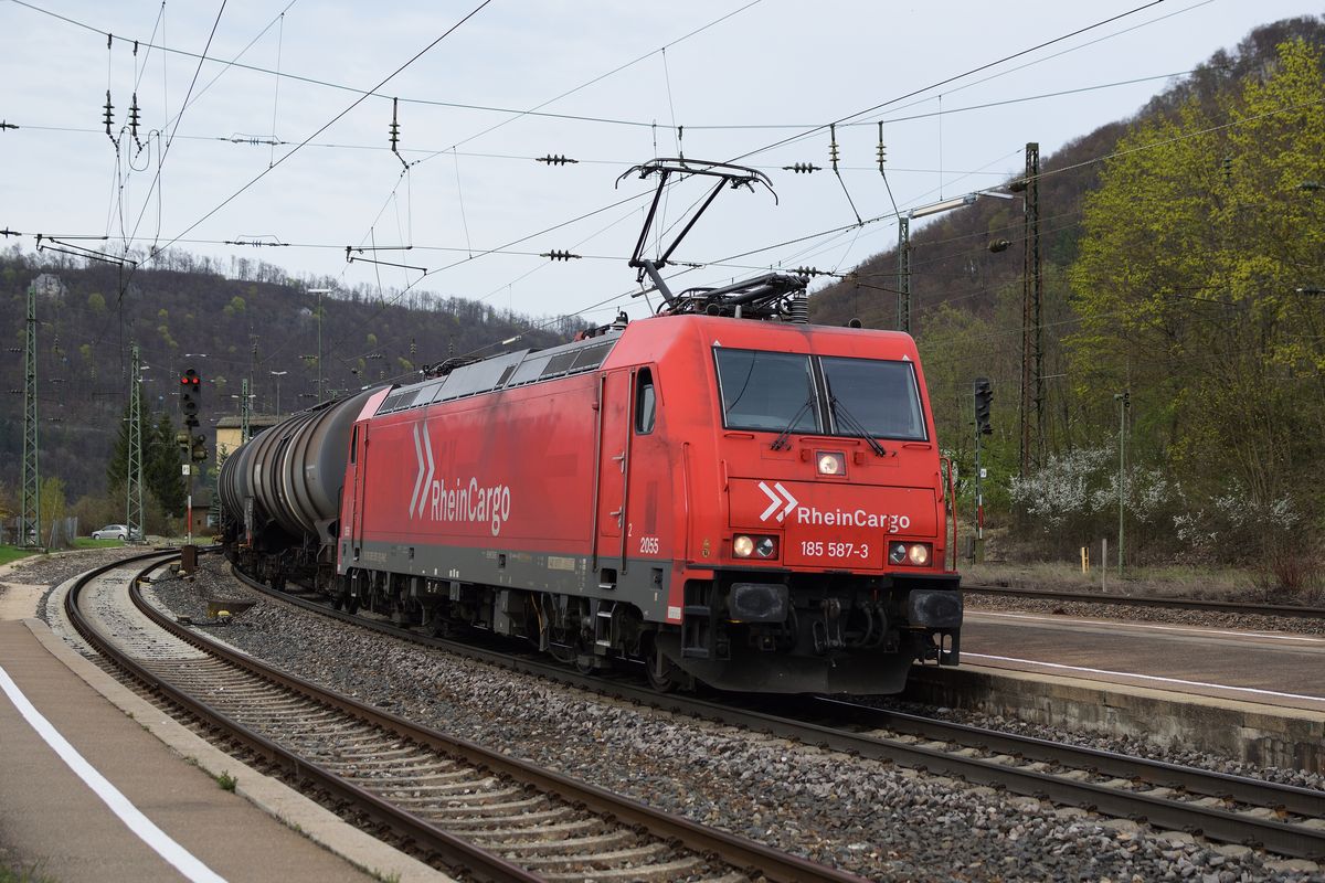 187 072-4 RheinCargo GmbH & Co. KG mit einem Kesselzug "Umweltgefährdender Stoff, flüssig" in Friesack und fuhr weiter in Richtung Nauen. 15.04.2018 Stephan Kemnitz