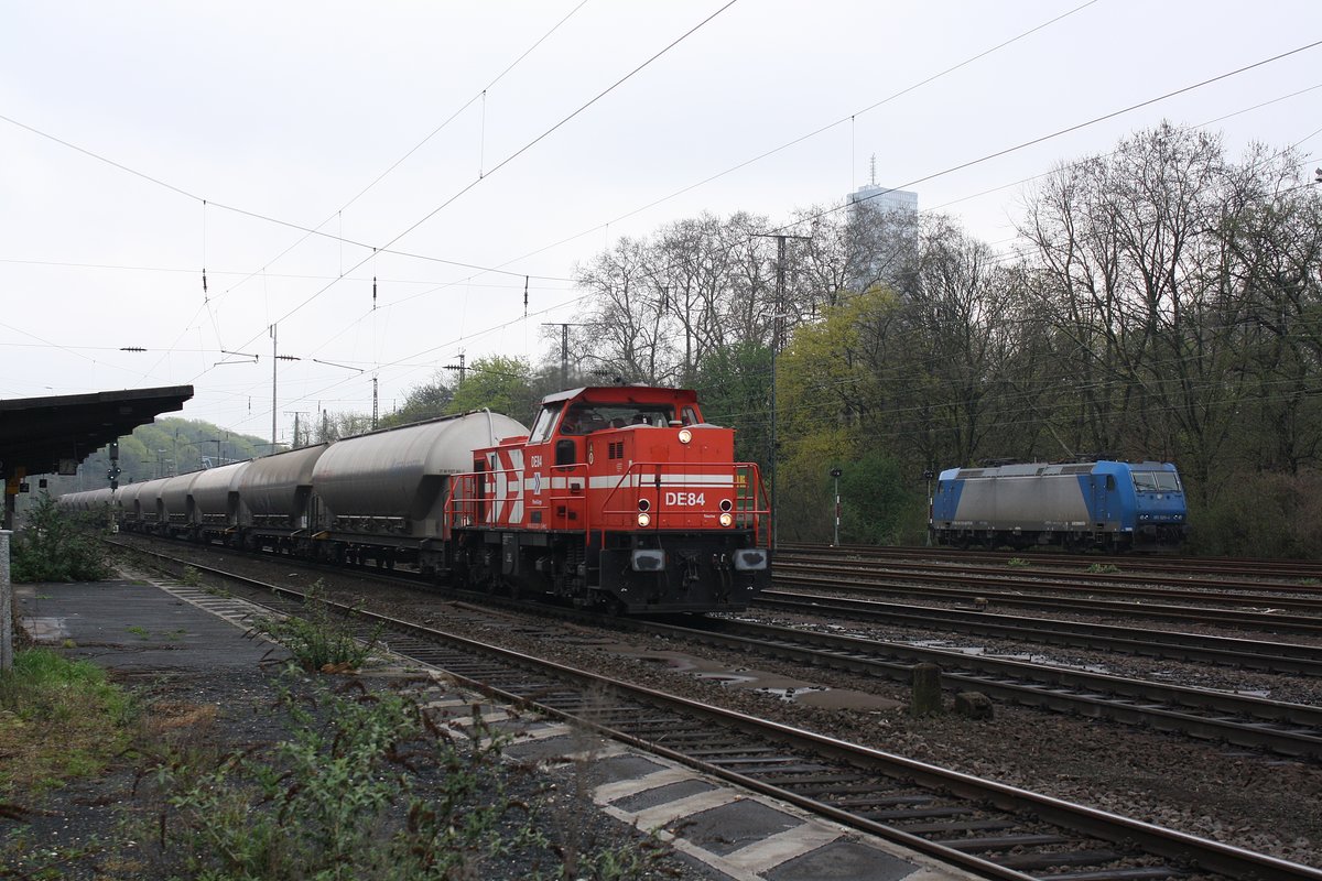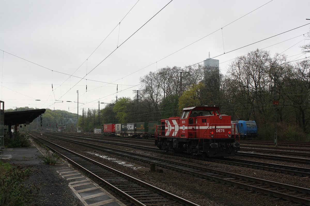 DE91 von Rheincargo rangiert im Güterbahnhof von Nievenheim. Aufgenommen vom einem Weg am Kirschfeld in Nievenheim. Bei schönem Frühlingswetter am Nachmittag vom 7.4.2018. Stefan Hochstetter