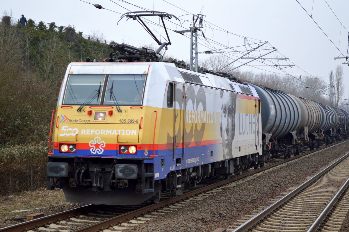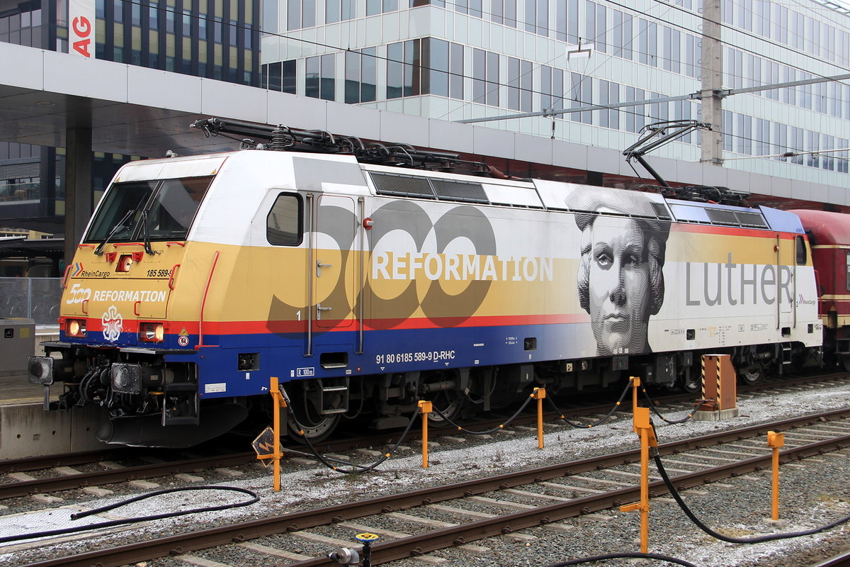 Die BR 185 589-9 "500 Jahre Reformation Luther" der Rhein Cargo bespannte den samstäglichen DRV13489 "Schnee Express" von Hamburg Hbf nach Bludenz. Aufgenommen am Innsbrucker Hbf am 3.3.2018. Christoph Plank