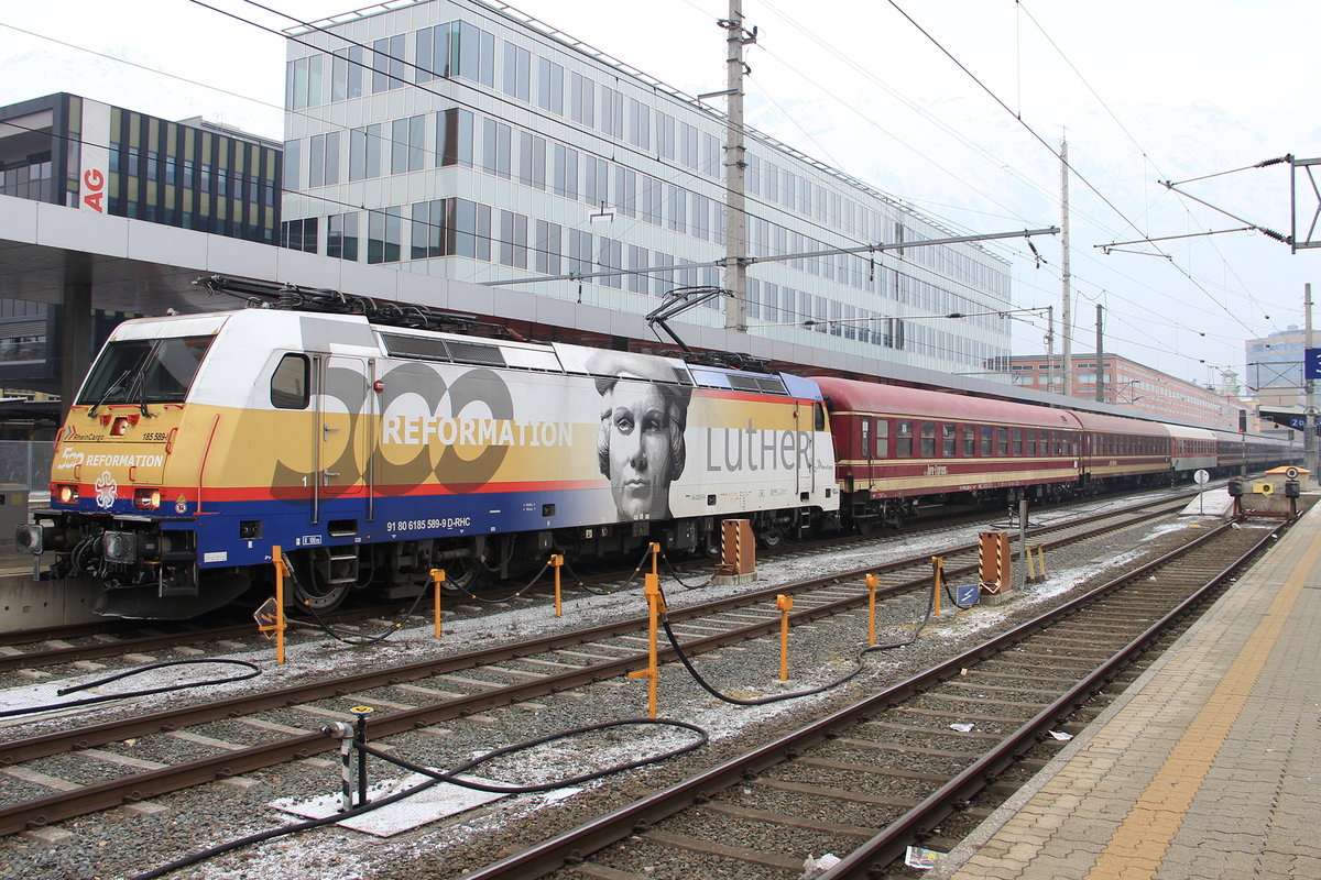 DRV13489 "Schnee Express" von Hamburg Hbf nach Bludenz dieses Mal mit der BR 185 589 "500 Jahre Reformation Luther" bespannt. Aufgenommen am Innsbrucker Hbf am 3.3.2018. Christoph Plank