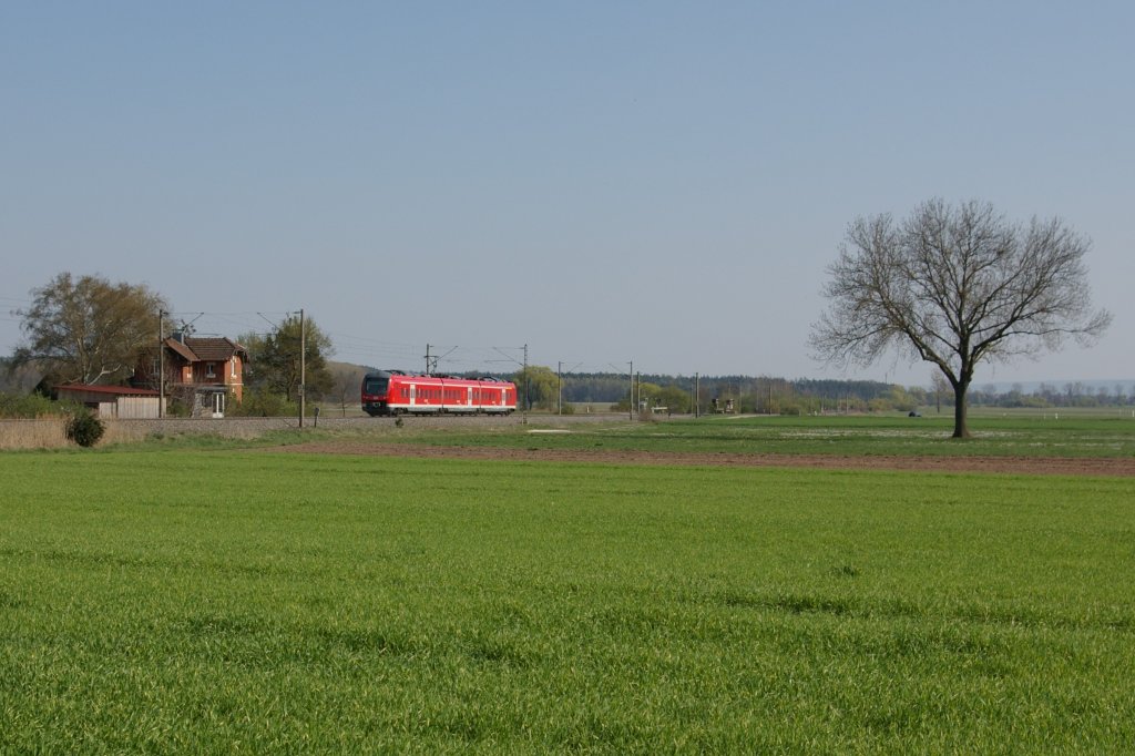 112 174 zieht ihre RB nach Würzburg durch den ehemaligen Haltepunkt Ehlheim. Jörg Schäfer stand am 20.5.09 auf den Überresten des Bahnsteigs nach Treuchtlingen, als er das Bild schoss. Der Bahnsteig Richtung Gunzenhausen ist hinter der Lok zu erahnen. Jörg Schäfer