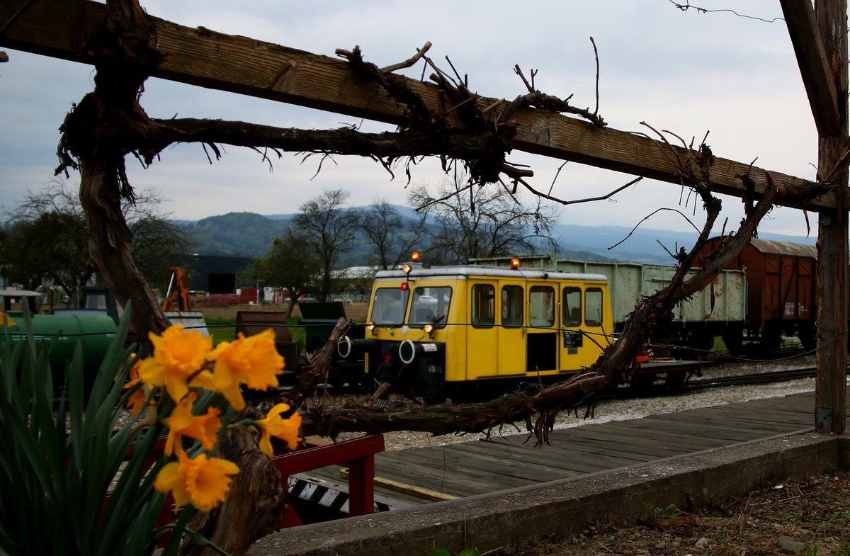 Langsam aber sicher geht die Narzissenzeit zu Ende und die Weintrauben werden beginnen den Durchblick auf X626.205 zu verhindern. Am 8.April 2016 steht eben dieser Abfahrbereit im Bahnhof Stainz um eine Arbeiterrotte von Eisenbahnkreuzung zu Eisenbahnkreuzung zu fahren damit diese von Stauden und Gestrüpp befreit werden können. Karl Heinz Ferk
