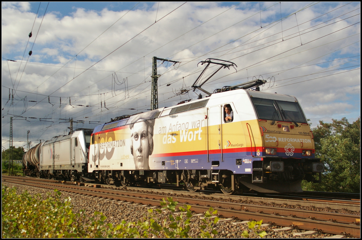Gefreut habe ich mich am 13. Juli 2017, als überraschend die 185 589 von RheinCargo mit einem leeren Kesselwagenzug vom Münchner Flughafen die Fotostelle bei Fahlenbach passierte. Diese Lok ist in meinen Augen einer der am besten gelungensten Werbeloks, die aktuell auf deutschen Schienen verkehrt. Sie erinnert an 500 Jahre Reformation. Selbige wird auf 1517 datiert, als Martin Luther seine 95 Thesen an die Tür der Schlosskirche zu Wittenberg geschlagen haben soll. Auch im katholischen Oberbayern ist die Lok ein "Hingucker". Christoph Schneider