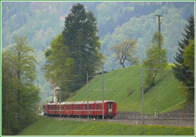 RE1049 nach Davos Platz nähert sich der Dienststation Fuchsenwinkel und führt zwei Glacier Pano mit sich. Zuglok ist Ge 4/4 III 648 "Susch". (05.05.2009) Herbert Graf