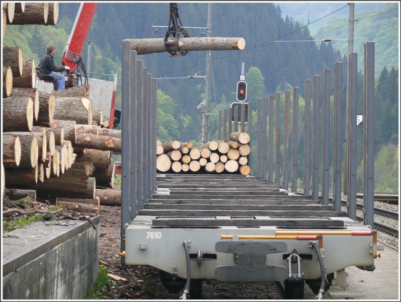 Ge 4/4 I 605 "Silvretta" hat zwei leere Holzwagen nach Furna gebracht und ist jetzt bei Schiers auf der Rückfahrt nach Landquart. (05.05.2009) Herbert Graf