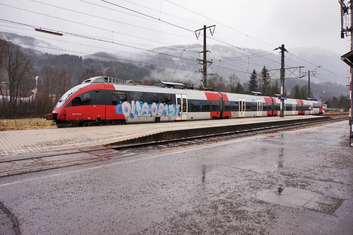 80-90.722 an der Spitze vom railjet 632 (Lienz - Wien Hbf), am 4.3.2016 beim Halt in Greifenburg-Weißensee. Schublock war 1116 222-1 "The Red Bulletin Fashion Train". Hans-Peter Kurz