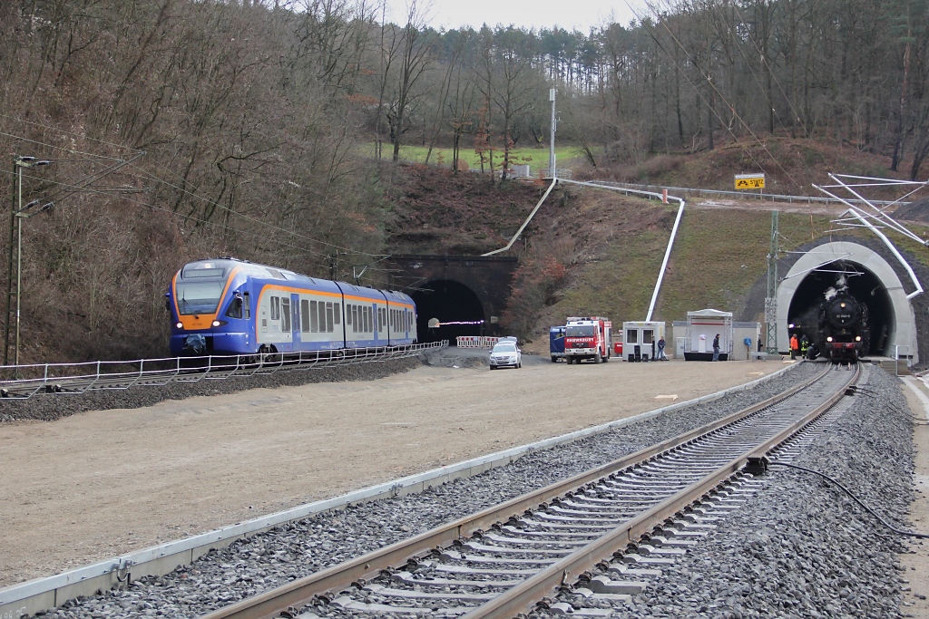 Während der Eröffnungsfeier der neuen Tunnelröhre wurde der gesamte restliche Zugverkehr zwischen Eichenberg und Bad Sooden-Allendorf eingleisig durch die alte Tunnelröhre abgewickelt. Gerade schaut ein 427 Cantus-Flirt mit Fahrtziel Göttingen vorbei. Aufgenommen am 17.12.2012. Jens Baumhauer