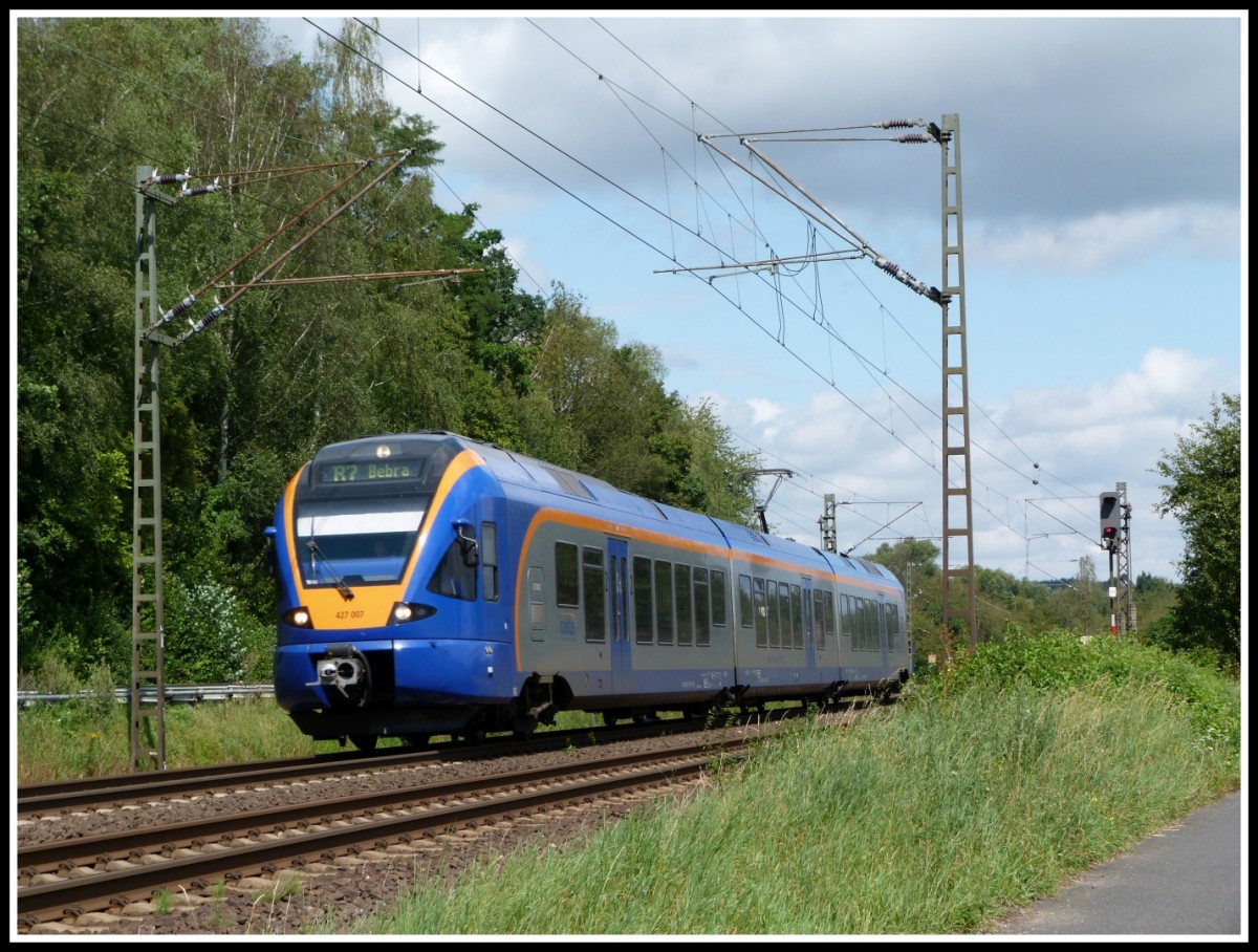 Während des Beobachtens des Arbeitsdienstes der Locon 201 (212 275-2) bei Gleisbauarbeiten in Eichenberg kam auch gleich Cantus' neuer vorbei. 428 007 ist der neuste Flirt im Fuhrpark der Cantus Bahn AG. Aufgenommen am 09.08.2012 in Eichenberg. Jens Baumhauer