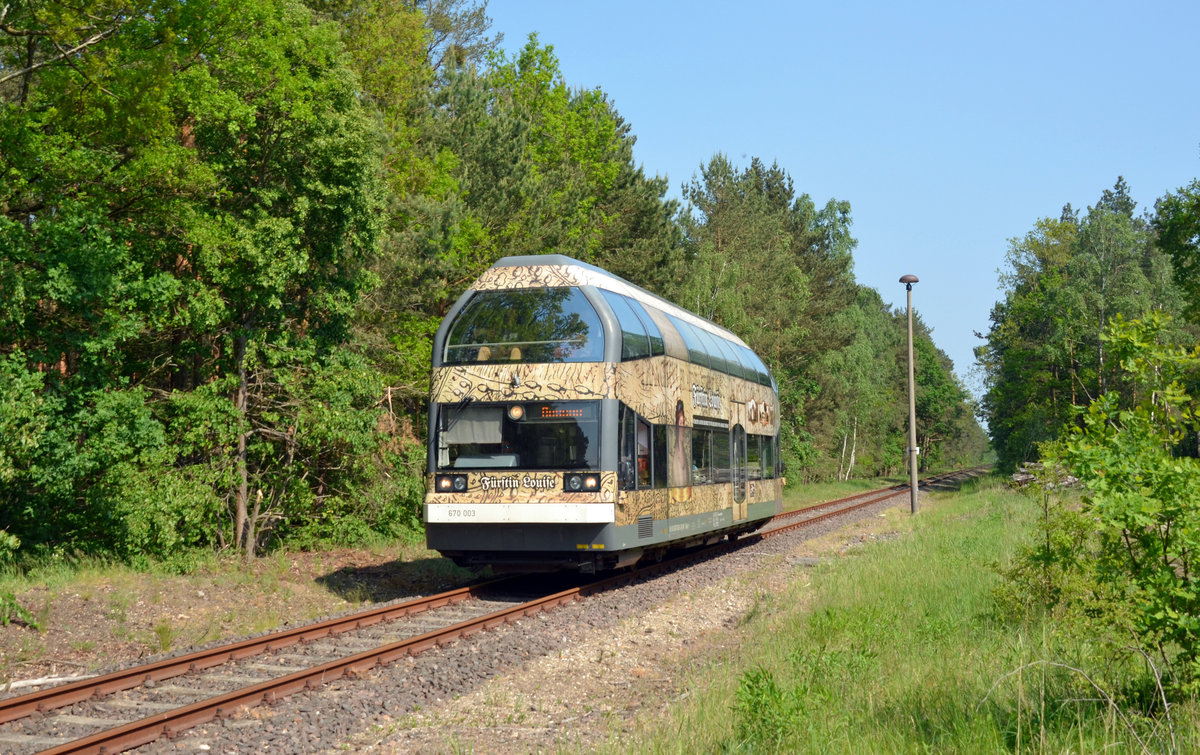 670 003 erreicht am 12.05.18 von Wörlitz kommend wiederum den Haltepunkt Biosphärenreservat. Anschließend führte die Fährt Fürstin Luise zum Dessauer Hbf. Martin Schneider